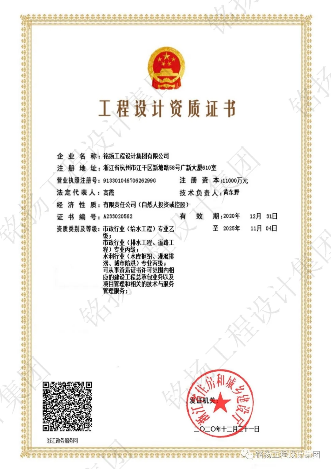 迄今為止,銘揚工程設計集團已經擁有建筑行業(建筑工程)甲級、風景園林工程設計甲級、城鄉規劃編制乙級、公路行業專業乙級、市政行業給水工程乙級、古建筑工程專業承包壹級、市政公用工程施工總承包貳級、建筑裝修裝飾工程專業承包壹級、建筑幕墻工程專業承包貳級、建筑機電安裝工程專業承包貳級、環保工程專業承包叁級、城市照明總承包叁級、建筑工程施工總承包叁級、水利水電工程施工總承包叁級、水利行業(水庫樞紐、灌溉排澇、城市防洪)專業丙級、市政行業(道路工程、排水工程)丙級資質。